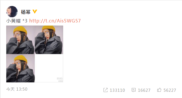 4日,杨幂在绿洲晒出一组美照,配文“小黄帽*3”,照片中的她带黄色针织帽搭配金边眼镜,穿着黑色宽松皮衣,潮范十足。