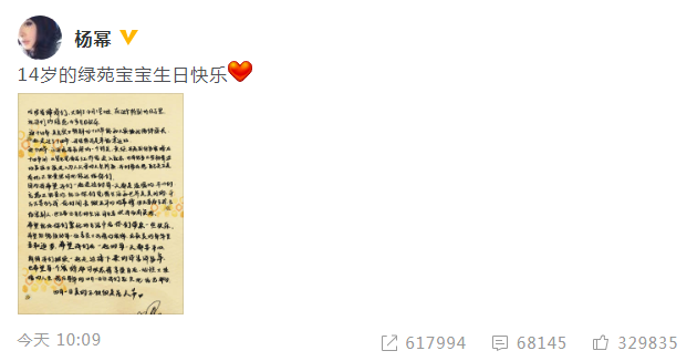 4月1日,杨幂在微博晒出一张手写信庆祝粉丝会成立14周年,并配文:“14岁绿苑宝宝生日快乐”。