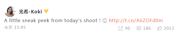 4月2日,木村光希在微博分享一段视频,并发文:“A little sneak peek from today‘s shoot!”