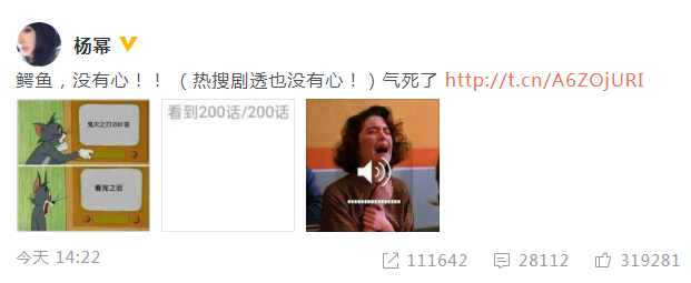 4月2日,杨幂追完动漫终章被剧情虐到发表情包,她发文写道:“鳄鱼,没有心!!(热搜剧透也没有心!)气死了”。