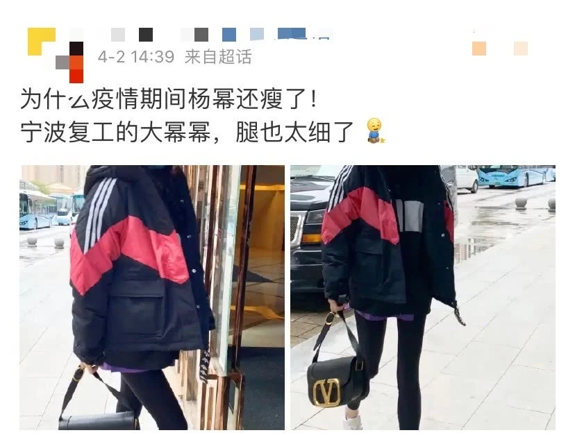 新浪娱乐讯 4月2日,有网友偶遇复工的杨幂,照片中杨幂身穿宽松外套搭配紧身裤,长腿纤细,疫情过后反而瘦成一道光。此前,杨幂分享疫情居家日常,不仅坚持健身晒马甲线,还在家自己煲汤喝,体重只有45.2kg。