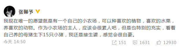 4月7日,张馨予在微博发文透露想拥有一个小农场,还表示:“看着自己养的母猪生下15只小猪,我还是接生婆,感觉会很自豪。”
