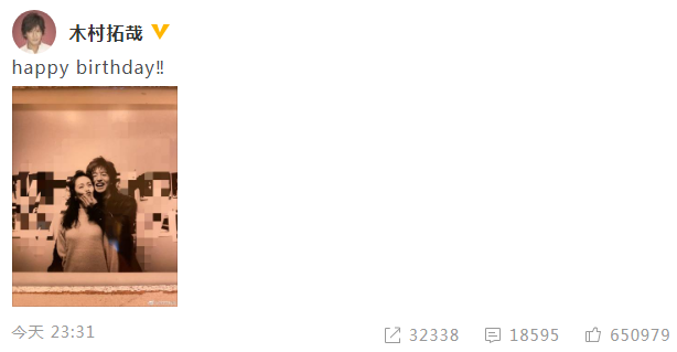 4月14日是工藤静香的生日,日本时间零点31分,木村拓哉在微博首次晒出合影为老婆庆生,“happy birthday”。