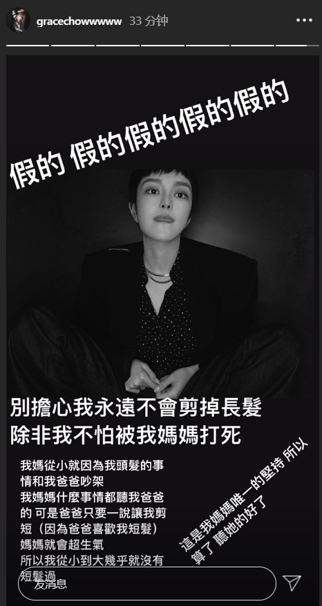 新浪娱乐讯 4月16日,周扬青在社交平台上晒出了一张短发照片。照片中,周扬青顶着一头超短的短发出镜,立马引起了网友的疯狂议论。随后,周扬青在线上自我辟谣,连着回应了五个假的,并表示自己永远不会剪掉长发。