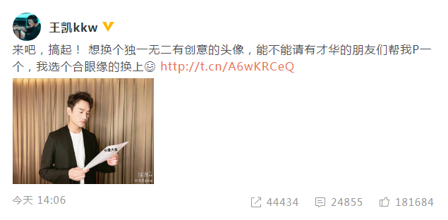 4月17日,王凯绿洲分享近照,并配文:“想换个独一无二有创意的头像,能不能请有才华的朋友们帮我P一个,我选个合眼缘的换上”。
