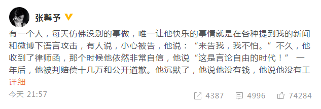 新浪娱乐讯 4月21日晚,张馨予[微博]通过微博发表长文,称之前一直对她言语攻击的人受到了法律的制裁,但对方却说自己没有钱没有工作。对此,她表示“在法律面前没法逃脱,伤害了别人,就要对自己的言行负责,没有退让。现在继续‘言论自由’的人还有,别急,慢慢来。”