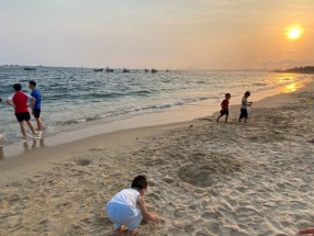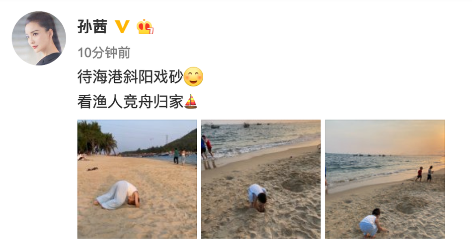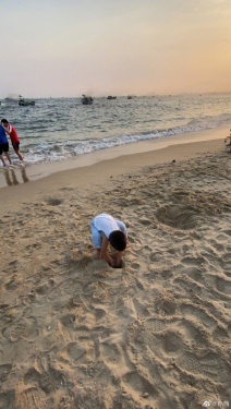 新浪娱乐讯 4月22日,孙茜在微博晒出一组儿子在沙滩上玩耍的照片,并配文:“待海港斜阳戏砂,看渔人竞舟归家”。照片中孙茜的儿子穿着小背心,十分顽皮地在沙滩上做前滚翻的动作,小小的脑袋顶着沙子,呆萌可爱。夕阳的映照下画面超唯美,温馨动人。