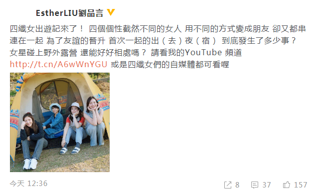新浪娱乐讯 4月22日,刘品言在微博分享与好友的合照,并配文:“四纤女出游记来了!四个个性截然不同的女人,用不同的方式变成朋友,却又都串连在一起。为了友谊的晋升,首次一起的出(去)夜(宿)”。照片中刘品言、杨谨华、宋芸桦和夏于乔四人在野外露营,她们坐在自己扎的帐篷前,装扮休闲,对镜自信灿笑。