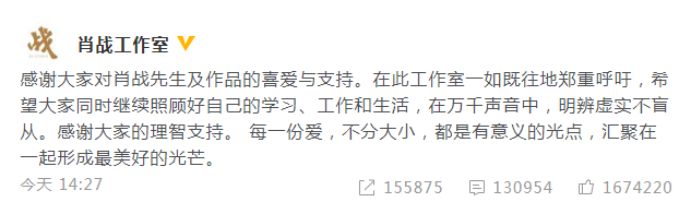 4月25日,肖战工作室发布微博呼吁粉丝能照顾好及的学习、工作和生活,在万千声音中,明辨虚实不盲从,并感谢粉丝的理性支持。