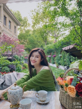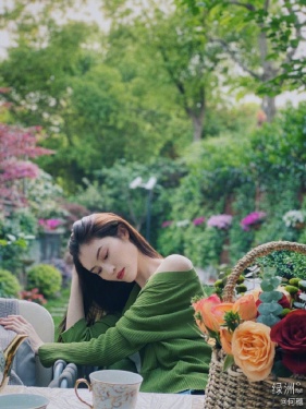 >组图:何穗绿洲分享春日穿搭 着绿色开衫置身花园清新悠闲
