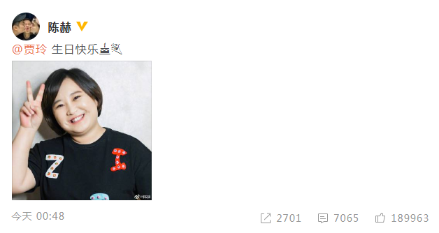 4月29日,贾玲迎来38岁生日,好友陈赫凌晨准时在微博晒照送祝福,大方at她并发文:“生日快乐”。