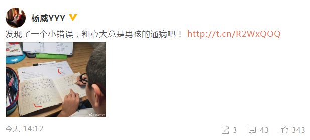 5月8日,杨威在微博晒照分享儿子杨阳洋做作业中的搞笑小插曲,发文称:“发现了一个小错误,粗心大意是男孩的通病吧!”
