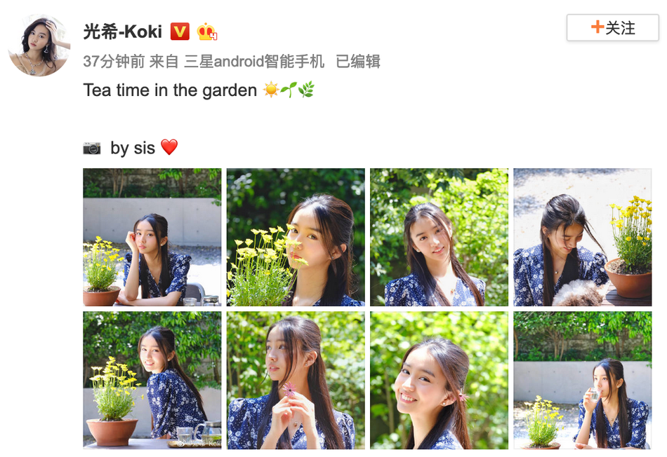 新浪娱乐讯 5月11日,木村光希在微博分享一组姐姐心美掌镜的初夏美照,并配文:“花园中的下午茶时光”。照片中的光希身穿蓝白碎花裙,将长发半扎起来,她捧着开满花朵的花盆对镜微笑,似邻家少女,清纯可人,尽显温柔气质。