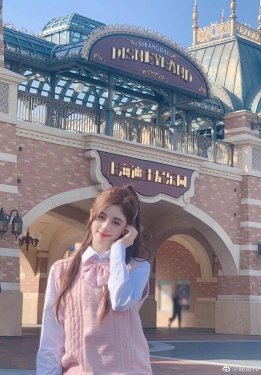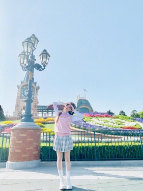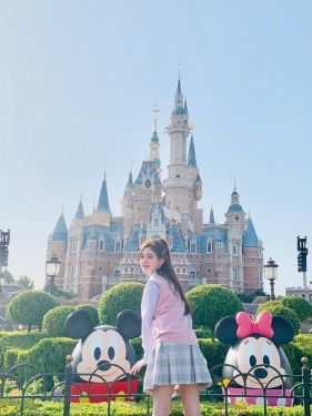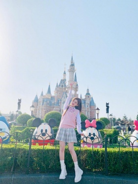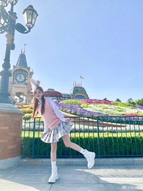 组图:鞠婧祎校服造型游迪士尼阳光元气 格子短裙大秀美腿