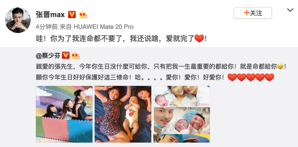 新浪娱乐讯 5月19日是张晋的46岁生日,妻子蔡少芬在微博晒出一家人的合影和三个孩子出生时的照片,发文为老公庆生:“亲爱的张先生,今年你生日没什么可给你,只有把我一生最重要的都给你!就是命都给你!愿你今年生日好好保护好这三条命!爱你!爱你!好爱你!”随后张晋甜蜜回应道:“哇!你为了我连命都不要了,我还说啥,爱就完了!”
