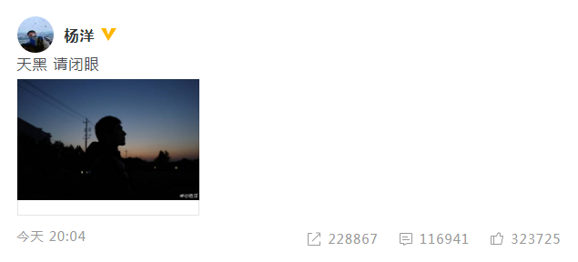 5月18日,杨洋在微博晒出一张侧颜剪影照,并配文:“天黑请闭眼”。