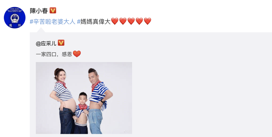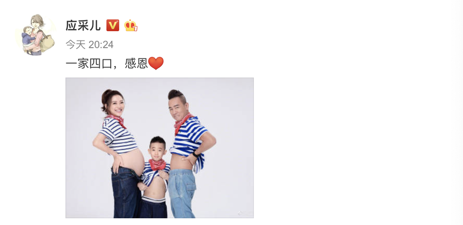 组图:应采儿诞下二胎儿子 晒一家四口合影幸福温馨