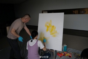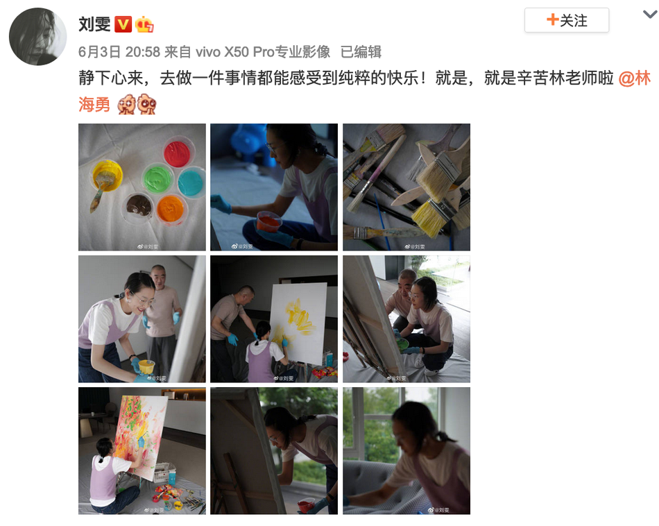 新浪娱乐讯 6月3日晚,刘雯在微博分享自己画油画的照片,发文:“静下心来,去做一件事情都能感受到纯粹的快乐!就是辛苦林老师啦”并at艺术家林海勇表示感谢。照片中的刘雯身穿白T外搭淡紫色背心,她戴着眼镜,将头发随意扎起,手拿笔刷十分认真细致地在巨大的画布前创作着,文艺范儿十足。