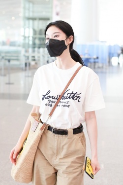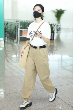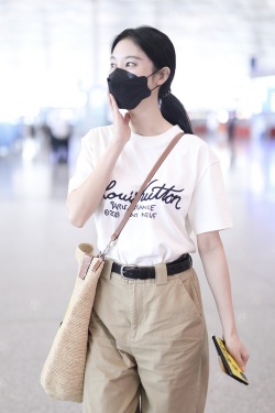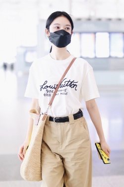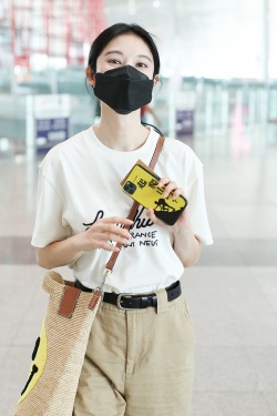 6月29日,北京,张俪现身机场。她身穿字母T恤和卡其色长裤,背着笑脸斜挎包青春可爱,手机壳上的“一起爬山吗”十分抢镜。(视觉中国/图)