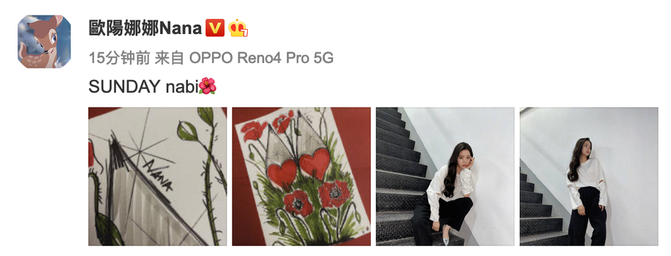 6月28日,欧阳娜娜在微博晒出近照与手绘涂鸦,并发文:“SUNDAY nabi”。照片中欧阳娜娜留着大波浪偏分长发,身穿白色长袖上衣搭配黑色西装裤,脚踩银色尖头鞋,一改可爱少女风,展轻熟女人味。