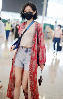 组图:万茜灰色T恤搭配牛仔热裤秀美腿 胳膊未愈挂绷带清早现身