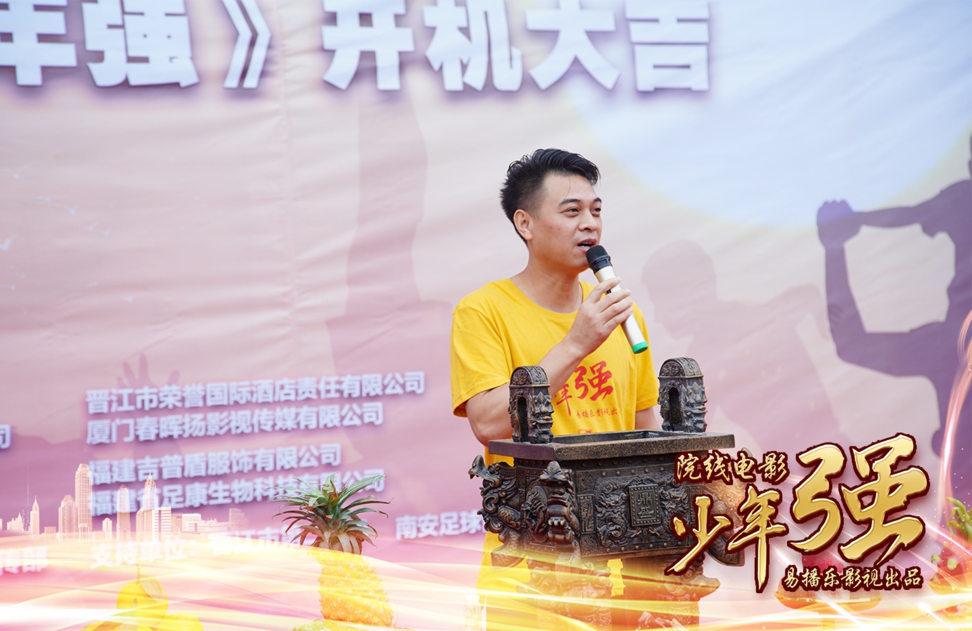 开机仪式上,总制片人泉州新余商会会长兼党支部书记、易天集团董事长易五根致词:首先感谢晋江二中吴健康校长及校其它领导的热心支持,感谢晋江市委宣传部和其它各部门单位,感谢泉州宜春商会会长、宇帆体育科技公司董事长余财平;泉州萍乡商会会长兼党支部书记、福建省足康生物科技公司董事长叶涛;福建省江西商会第三届会长、荣誉酒店集团总裁胡连荣;出品单位:泉州易播乐影视文化有限公司、晋江市荣誉国际酒店责任有限公司、北京易天国际影视文化有限公司、厦门春晖扬影视传媒有限公司;联合出品:攻夫足球x舒莱狮体育、福建省足康生物科技有限公司、福建吉普盾服饰有限公司、泉州市宇帆体育科技有限公司,指导单位:晋江市委宣传部、南安市委宣传部、支持单位:晋江市第二中学、南安足球协会,赞助单位:真华仔土鸡等其它投资赞助企业,作为江西人在晋江创业的我,深知创业难,守业更难,尤其是下一代,面对自己小孩逐渐长大成人,15岁了,开始有点叛逆,却束手无策,特意投资拍摄这部《少年强》,国之强在于我少年,少年强则国强,借此片《少年强》献给伟大的祖国建党100周年。并祝愿祖国强大,繁荣昌盛,早日成为世界一流强国。也祝愿该片开机大吉。