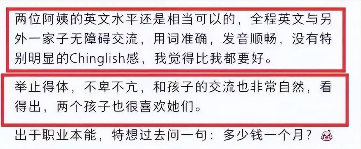 网友们偶遇撒贝宁一家人,除了他们一家四口还有两位保姆帮忙照顾两个孩子,两位阿姨的英文水平还是相当可以的,全程英文与另外一家子无障碍交流,用词准确,发音顺畅,没有特别明显的口音,觉得网友不如她们。虽然是保姆举止得体,大方自然,和孩子的交流也非常顺畅,看得出来,两个孩子也很喜欢她们。网友很想知道如此高水平的保姆,一个月多少钱?