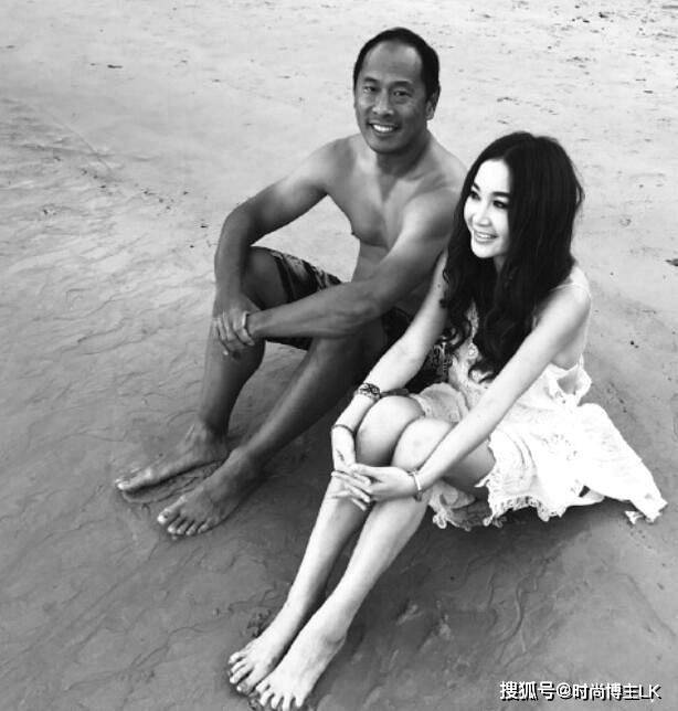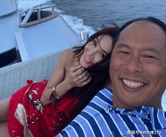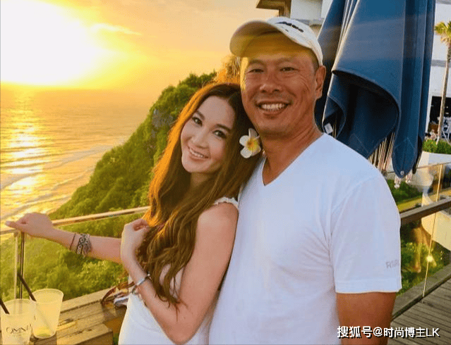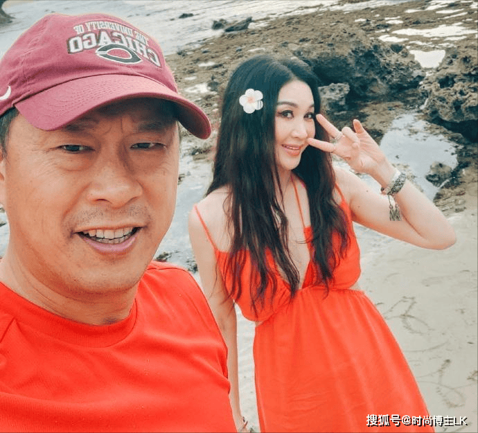 照片中温碧霞穿着一袭白色吊带裙,头戴着花环,肤白貌美的依偎在老公怀里,而她的富豪老公却笑的满脸褶子,脸是黑的不像话,两人形成鲜明的反差。