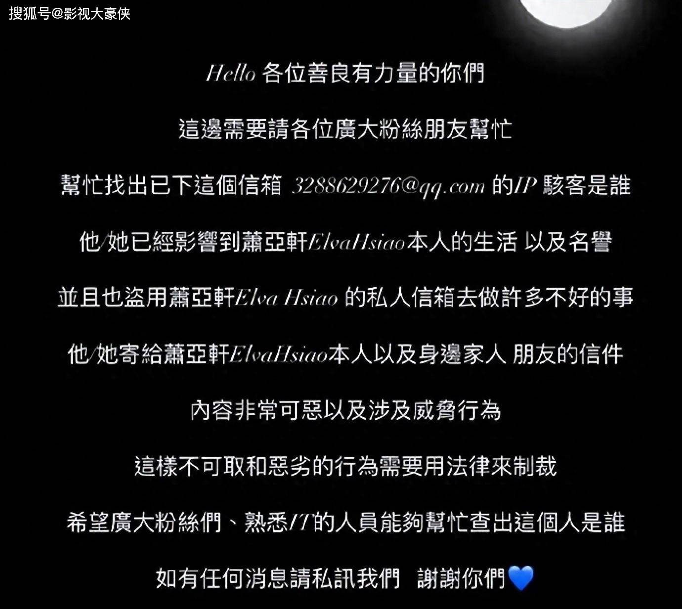 萧亚轩表示,这名黑客不仅盗用了她的私人邮箱,还做了许多不好的事,“他/她寄给萧亚轩本人以及身边家人朋友的信件,内容非常可恶以及涉及威胁行为。”她表示,这名黑客的行为已经影响到她的生活以及名誉,需要法律制裁。