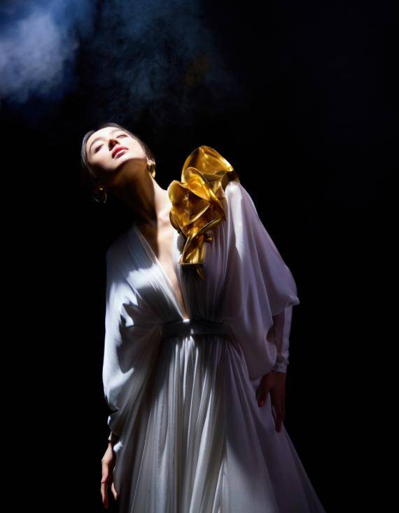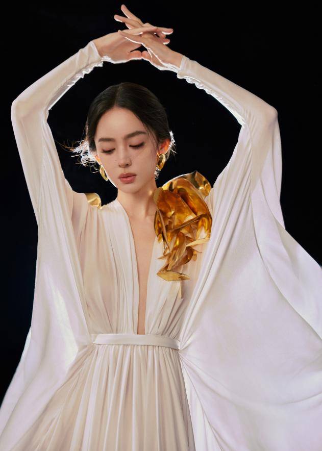 照片中,古力娜扎穿着一袭飘逸而优雅的白色长裙,仿佛一位从童话世界走出的公主。这件礼服的设计简约而不失高贵,完美地勾勒出她曼妙的身材曲线。领口低至胸部,展现出她性感的锁骨和迷人的事业线,令人瞩目。宽大的袖子设计,不仅增加了整体的层次感,还让她看起来更加高贵典雅。腰部的褶皱设计,巧妙地修饰了她的腰线,使她看起来更加纤细动人。