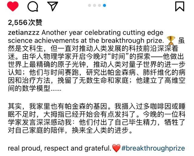 昨天,她更新了社交账号。根据所发的文字可知,她去参加了今年的“科学突破奖”颁奖典礼。