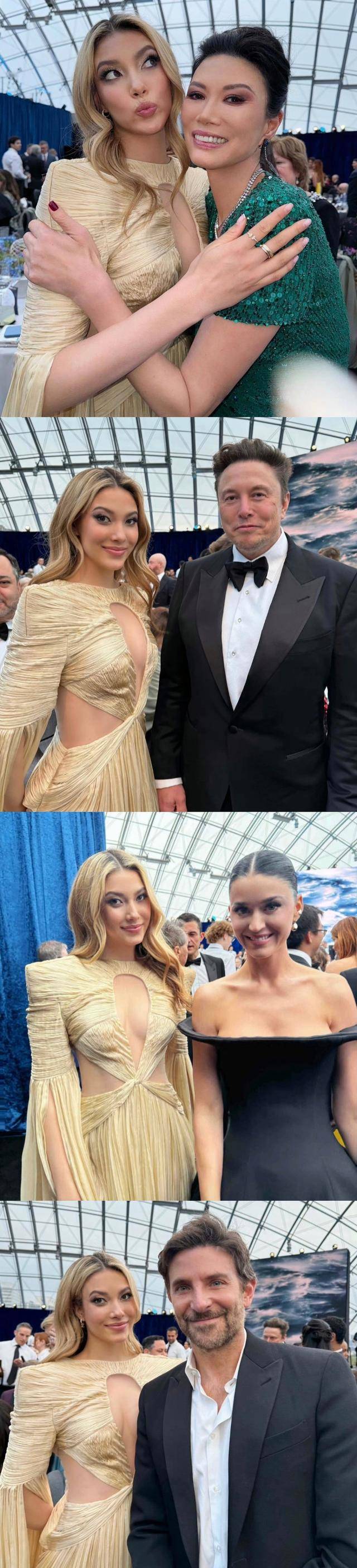 而谷爱凌则与邓文迪、马斯克等人合影了,只见她身穿一件黄金战袍,满手的镯子和戒指;邓文迪身穿一件绿色亮片裙子,戴了一根银色项链,相比之下素一点。