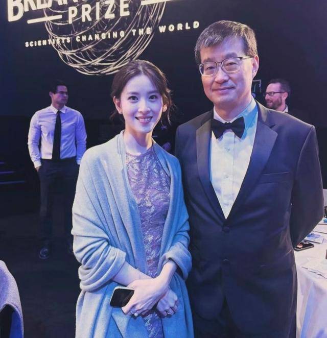 第三张是她和一位头发有些花白的中年男子的合影。据悉,这位男子是叶军,是一位牛人,中科院外籍院士、物理学家。而他也是这次典礼的嘉宾。