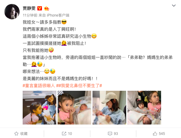 新浪娱乐讯 17日晚,贾静雯在微博晒出抱刚出生的侄女的照片,还分享两个女儿的故事。咘咘bo妞站在熟睡的妹妹旁边乖巧,一直想要摸妹妹但都被贾静雯阻止,结果还问她:“弟弟呢?妈妈生的弟弟呢?”童言无忌十分可爱。