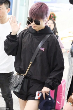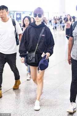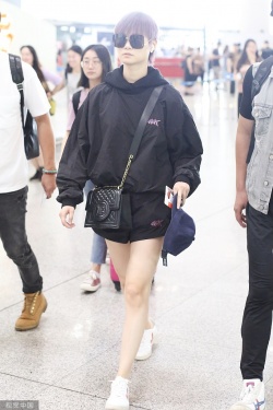 新浪娱乐讯 6月22日,李宇春现身北京机场,她身穿黑色黑色运动装,着黑色短裤秀美腿,染绚丽紫发炫酷十足,挥手致意姿势帅呆了。(视觉中国/图)