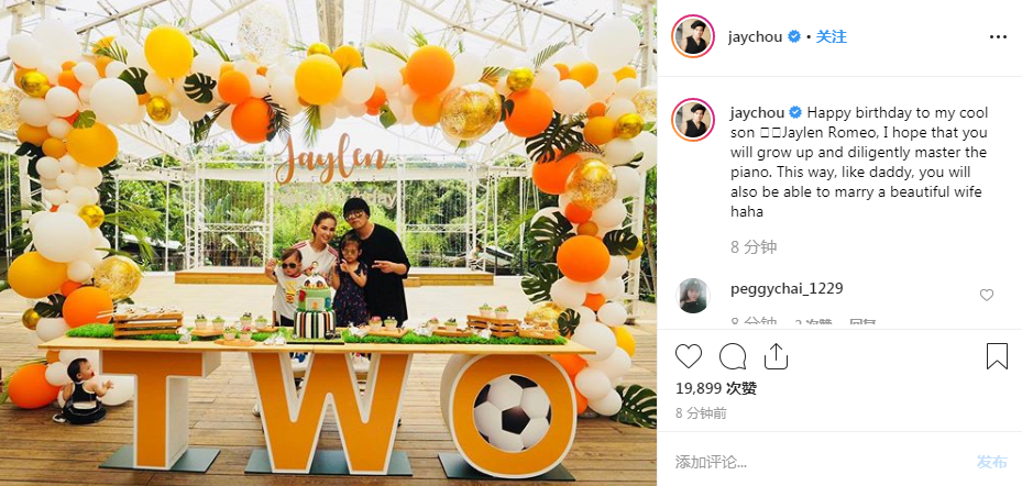 新浪娱乐讯 6月25日,周杰伦深夜在社交网站上传了一张儿子罗密欧两岁生日派对的现场照。周杰伦还写道:“生日快乐,我的酷儿子杰伦·罗密欧,我希望你能快点长大,努力学习钢琴。这样,像爸爸一样,你也可以娶一个漂亮的妻子,哈哈。”照片中,周杰伦和儿子女儿都戴着墨镜,昆凌对镜甜笑。一家四口正面照罕见曝光,看起来十分甜蜜幸福。