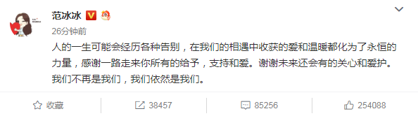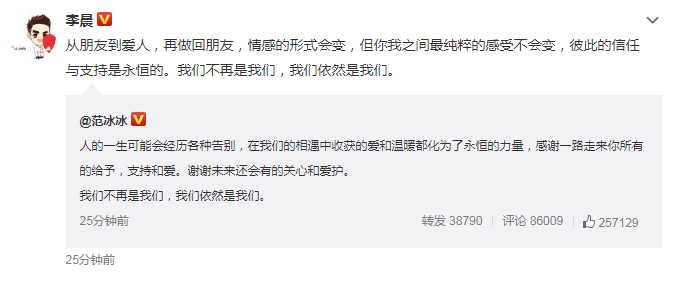 新浪娱乐讯 6月27日晚,范冰冰发文“人的一生可能会经历各种告别,在我们的相遇中收获的爱和温暖都化为了永恒的力量,感谢一路走来你所有的给予,支持和爱。谢谢未来还会有的关心和爱护。我们不再是我们,我们依然是我们。”随后李晨转发“从朋友到爱人,再做回朋友,情感的形式会变,但你我之间最纯粹的感受不会变,彼此的信任与支持是永恒的。我们不再是我们,我们依然是我们。”据悉,2015年5月29日,二人在微博发文“我们”官宣恋情,2017年9月16日,李晨在范冰冰生日宴上向范冰冰求婚成功,如今两人四年恋情告吹。