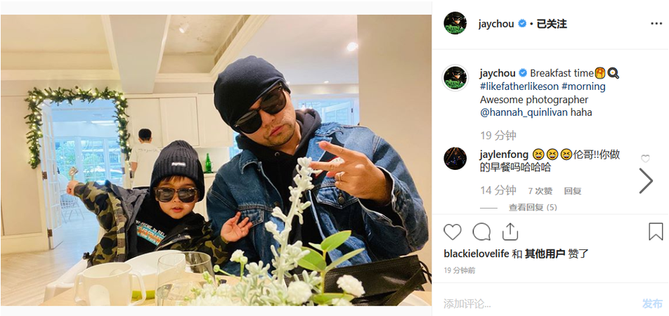 新浪娱乐讯 新浪娱乐讯 12月5日,周杰伦在个人社交网站晒出与儿子的合照,并发文:“Breakfast time(早餐时间)”,周杰伦带儿子吃早餐,父子俩同戴墨镜扮酷,小小周手里举着勺子,穿着迷彩外套,戴着黑色毛线帽,潮范儿十足。
