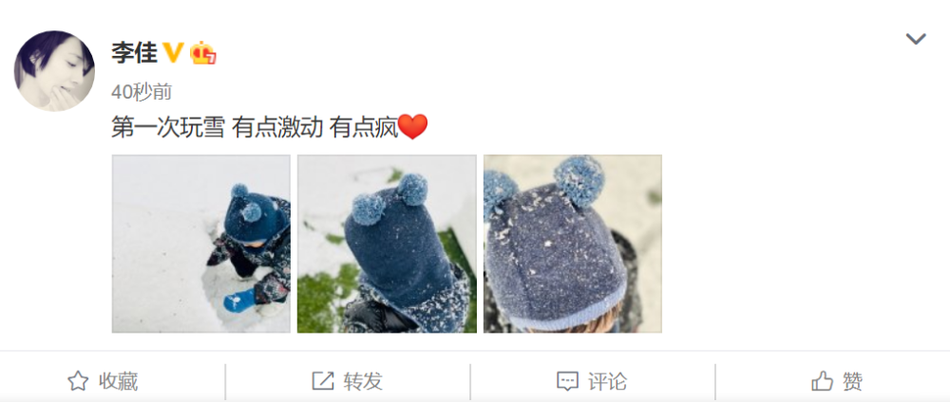 新浪娱乐讯 12月16日,靳东妻子李佳在微博上晒出了几张小儿子的照片,并配文:“第一次玩雪,有点激动,有点疯”。照片中,小儿子戴着一顶厚厚的小熊帽子,正在开心的玩雪。帽子衣服上都是白色的雪花,长长的眼睫毛和挺翘的鼻子清晰可见,非常可爱。