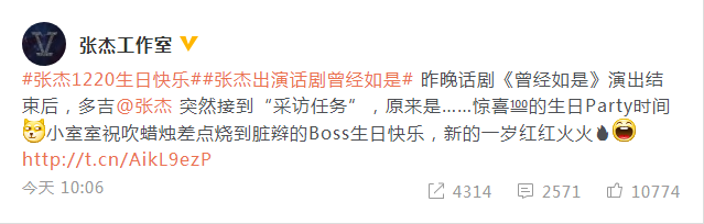 12月20日,张杰工作室更新视频:“昨晚话剧《曾经如是》演出结束后,张杰突然接到“采访任务”,原来是惊喜的生日Party时间!”
