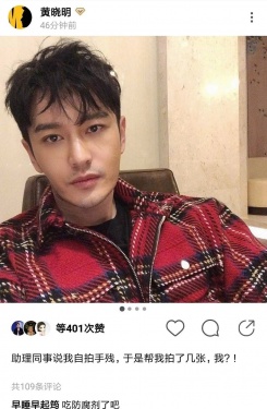 20日,黄晓明更新绿洲久违晒自拍,自称“今天是小卷毛”。照片中“教主”穿着红色格纹衬衫头顶卷发看向镜头,十分显瘦。