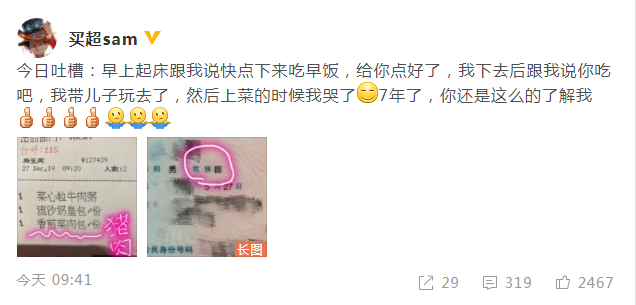 12月27日,买超[微博]在微博上吐槽爱妻张嘉倪[微博]粗心大意的趣事并配上照片,发文:“今日吐槽:早上起床跟我说快点下来吃早饭,给你点好了,我下去后跟我说你吃吧,我带儿子玩去了,然后上菜的时候我哭了。7年了,你还是这么的了解我。” 从照片中的早餐小票可以看出张嘉倪为老公点了含有猪肉的早餐,买超还晒出身份证表示自己是地道的“回族胃”,他宠溺又无奈地吐槽老婆的粗心大意,令网友调侃:“我表示非常同情你,同时不由自主地笑了。”
