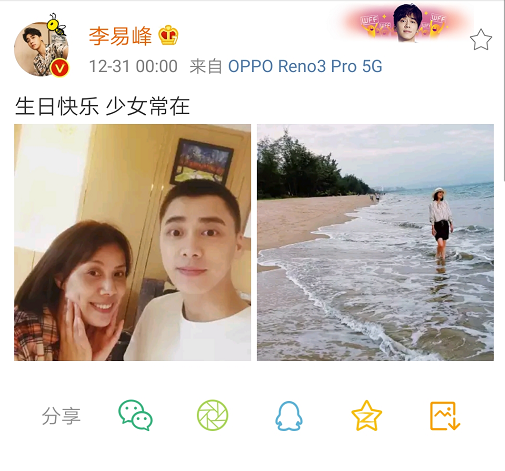 12月31日,李易峰零点准时在微博上晒出了合影为妈妈庆生,并配文:“生日快乐,少女常在”。照片中,母子两人对着镜头微笑,十分温馨。此外,李易峰还晒出了妈妈在海边的照片,李妈妈保养的很好,气质优雅。