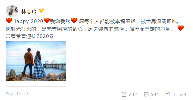 去年升格为人妻的林志玲,还在甜蜜喜悦的心情中,2020开年第一天,就又不忘在微博上发布合照,大秀恩爱。
