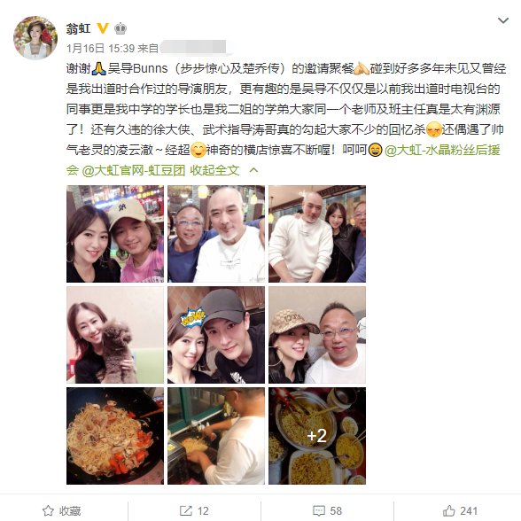 1月16日,翁虹在微博晒出跟朋友聚餐的照片,称碰到了好多多年未见,又曾经是她出道时合作过的导演朋友,照片中不仅有吴锦源导演,还有翁虹口中所说的“徐大侠”。