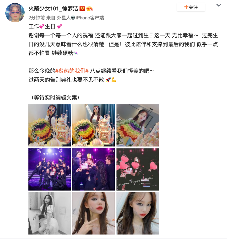 6月19日是火箭少女徐梦洁的生日,她晒出自拍与队友为其庆生的照片,并发文:“谢谢每一个人的祝福,还能跟大家一起过到生日这一天,无比幸福~过完生日的没几天意味着什么也很清楚。但是!彼此陪伴和支撑到最后的我们 似乎一点都不怕累,继续硬糖。”