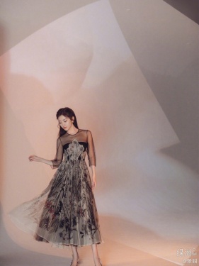 >组图:景甜绿洲分享夏日写真 穿黑纱印花长裙优雅大气美如画