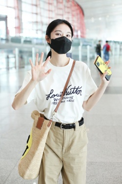 6月29日,北京,张俪现身机场。她身穿字母T恤和卡其色长裤,背着笑脸斜挎包青春可爱,手机壳上的“一起爬山吗”十分抢镜。(视觉中国/图)