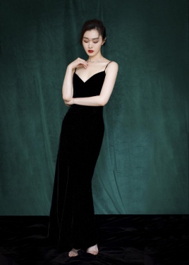 化身眼神柔媚的港式女郎,黑色吊带长裙超显身材,一颦一笑足以让人怦然心动。