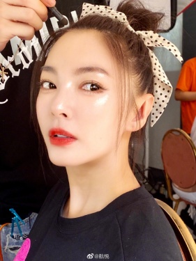 组图:张雨绮头绑蝴蝶结化轻透妆容 唇红齿白对镜甜笑似少女